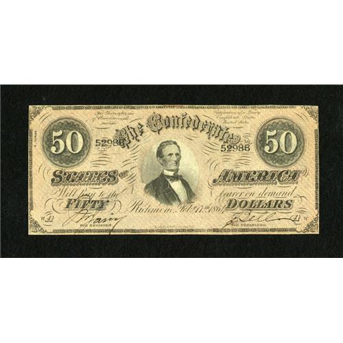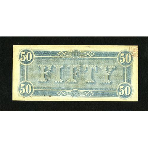 <B>T66 $50 1864.</B></I> The back upper right corner reveals a portion of a Confederate Treasury Seal. <B>About Uncirculated.</B></I><BR><BR><b>Shipping:</b> Coins & Currency (<a target="_blank" href="http://www.heritageauctions.com/common/shipping.php">view shipping information</a>)