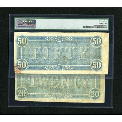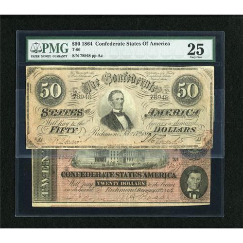 <B>T66 $50 1864<BR>and a T67 $20 1864.</B></I><BR> This pair is perfectly matched with a grade of <B>PMG Very Fine 25.</B></I> Vivid colors are noted.<BR><BR><b>Shipping:</b> Coins & Currency (<a target="_blank" href="http://www.heritageauctions.com/common/shipping.php">view shipping information</a>)