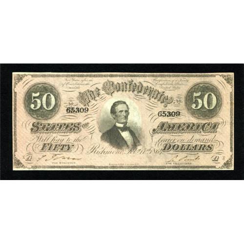 <B>T66 $50 1864.</B></I><BR> This $50 is closer to the high-end of the split grade. <B>Very Fine-Extremely Fine.</B></I><BR><BR><b>Shipping:</b> Coins & Currency (<a target="_blank" href="http://www.heritageauctions.com/common/shipping.php">view shipping information</a>)