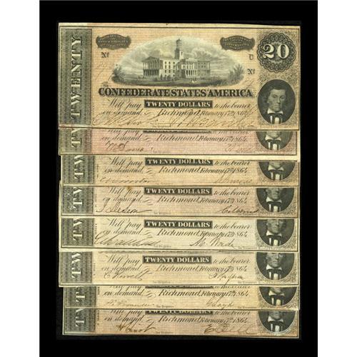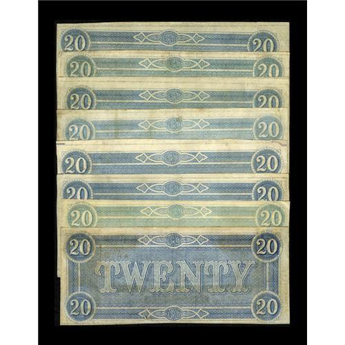<B>T67 $20 1864 Eight Examples.</B></I> This lot consists of a No Series <B>Fine-VF;</B></I> Series 1 <B>VF-XF;</B></I> Series 4 <B>AU;</B></I> 5 Series <B>AU;</B></I> VI Series <B>VF;</B></I> VII Series <B>VF-XF;</B></I> VIII Series <B>XF-AU;</B></I> and X Series <B>AU.</B></I><BR>