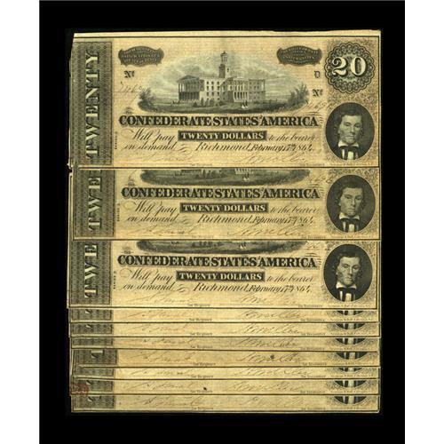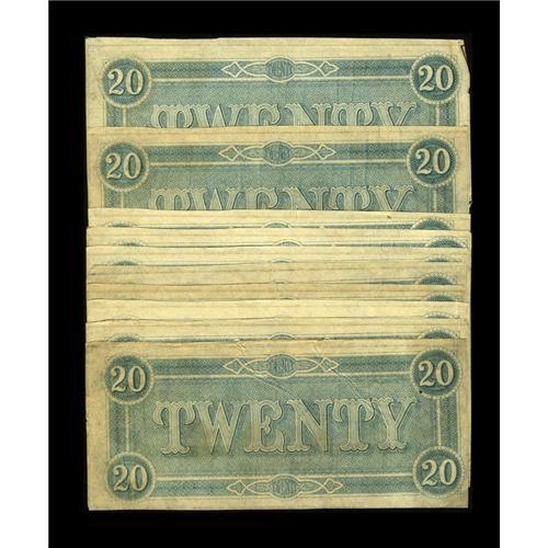 <B>T67 $20 1864. Ten consecutive examples</B></I> This run of notes all have a partial Treasury stamp at lower left, however, four notes have some extensive wrinkling from storage, along with a couple of small tears. <B>Extremely Fine - About Uncirculated.</B></I><BR><BR><b>Shipping:</b> Coin/Currency (<a target="_blank" href="http://www.heritageauctions.com/common/shipping.php">view shipping information</a>)