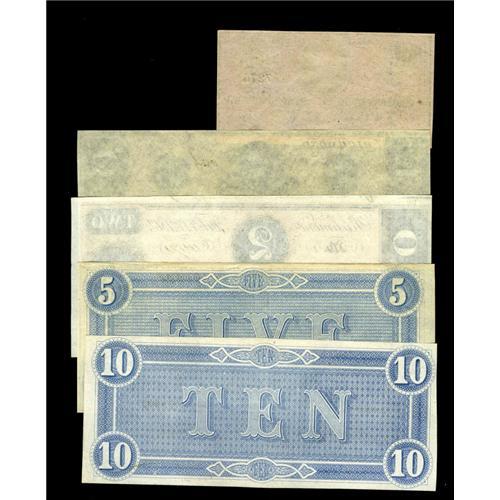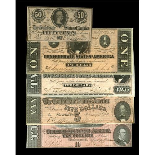 <B>T68 $10 1864 Choice CU</B></I><BR><B>T69 $5 1864 Choice CU</B></I><BR><B>T70 $2 1864 Choice CU</B></I><BR><B>T71 $1 1864 Choice CU</B></I><BR><B>T72 50 Cents 1864 Second Series Choice AU.</B></I><BR>A few pinholes are noticed on some of the notes.<BR><I>From The Benjamin Rush Powel Collection of Confederate Currency.</B></I>