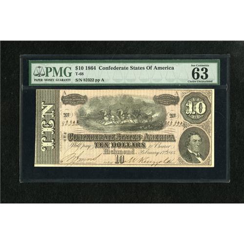 <B>T68 $10 1864.</B></I> PMG has given the "Exceptional Paper Quality" designation to this colorful note. <B>Choice Uncirculated 63 EPQ.</B></I><BR><BR><b>Shipping:</b> Coins & Currency (<a target="_blank" href="http://www.heritageauctions.com/common/shipping.php">view shipping information</a>)