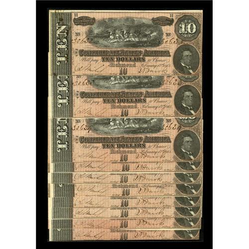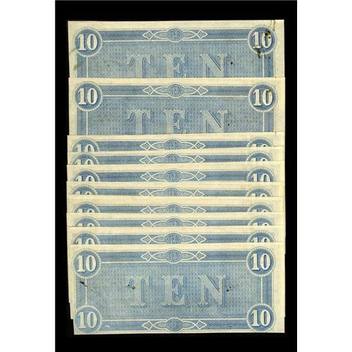<B>T68 $10 1864. Ten Examples.</B></I> A few runs of consecutive notes are seen in this lot that is so original ink bleed through is seen from the serial numbers on the backs of them. <B>Crisp Uncirculated.</B></I>