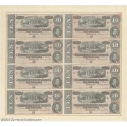 T68 $10 1864 Uncut Sheet of Eight. A lovely framed sheet of unsigned and unissued CSA $10s, most likely recovered from a group of these that were found after the Union capture of Richmond. Attractive matting and framing make this an item that should please some collector whose spouse or boss allows them to hang it on their home or office wall. Important notice: We expect to be auctioning lots at the rate of 200-250 per hour. Sometimes eBay Premier live bid software cannot keep up with that pace, so we strongly recommend that you place a realistic proxy bid now as insurance to avoid disappointment. Also please note that all Heritage/CAA lots purchased through eBay Premier carry a 20% Buyer's Premium. Please make sure you read the Terms and Conditions.