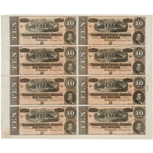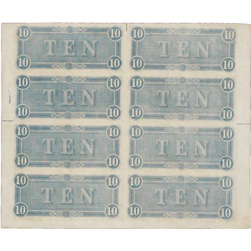<B>T68 $10 1864 Uncut Sheet of Eight.</B></I><BR> This is a well preserved sheet that is 100% bright. A couple of tiny edge tears are noticed along with a little handling in the lower left corner, but this sheet is still at least <B>Choice Crisp Uncirculated</B></I>. This sheet is unsigned and unnumbered and it also has two engraver's names in the face and back selvage. A full Confederate Treasury Stamp is also noticed.<BR><BR><b>Shipping:</b> Coins & Currency (<a target="_blank" href="http://www.heritageauctions.com/common/shipping.php">view shipping information</a>)