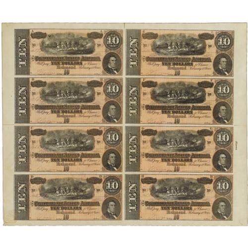 <B>T68 $10 1864 Uncut Sheet of Eight.</B></I><BR> The left-hand serial number and signature are present on each note. The second serial number and signature were never applied. This is a bright and appealing <B>Crisp Uncirculated </B></I>sheet.<BR><BR><b>Shipping:</b> Coins & Currency (<a target="_blank" href="http://www.heritageauctions.com/common/shipping.php">view shipping information</a>)