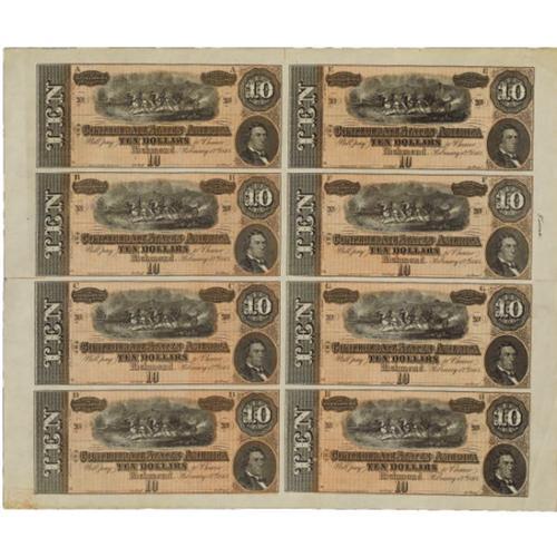 <B>T68 $10 1864 Uncut Sheet of Eight.</B></I><BR> This is a most attractive remainder sheet with a couple of minor margin folds and very slight storage marks at the outer margins. The sheet itself is fully bright and makes a wonderful display item. <B>About Uncirculated</B></I>.<BR><BR><b>Shipping:</b> Coins & Currency (<a target="_blank" href="http://www.heritageauctions.com/common/shipping.php">view shipping information</a>)