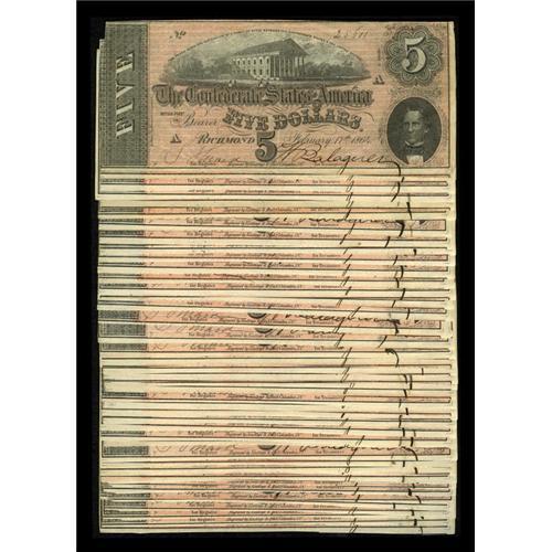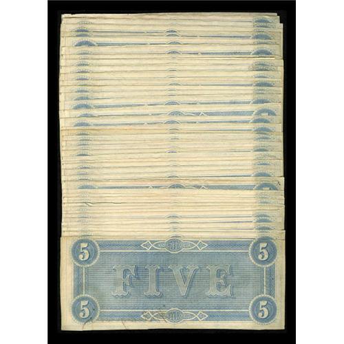 <B>T69 $5 1864 Forty-four Examples.</B></I><BR> This is a pleasing and wholly original group of CSA $5s. There run is near consecutive with only a couple of numbers missing. A similar lot with 44 near consecutive $5s in the same condition sold for $2,990 in April of 2006. Most of these notes grade <B>Crisp Uncirculated </B></I>with just a few falling below that grade level. <I>Inspection is advised as there will be no returns on this lot for any reason.</B></I><BR><BR><b>Shipping:</b> Coins & Currency (<a target="_blank" href="http://www.heritageauctions.com/common/shipping.php">view shipping information</a>)