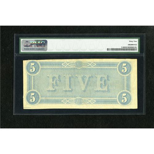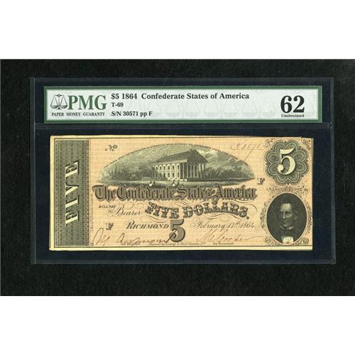 <B>T69 $5 1864.</B></I> The signatures are strong on this note graded PMG <B>Uncirculated 62.</B></I><BR><BR><b>Shipping:</b> Coins & Currency (<a target="_blank" href="http://www.heritageauctions.com/common/shipping.php">view shipping information</a>)