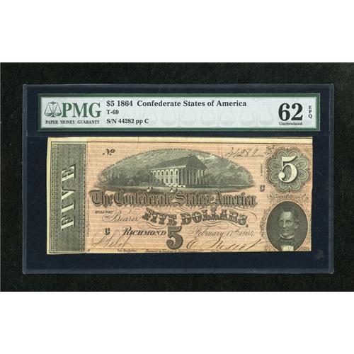 <B>T69 $5 1864.</B></I> This Memminger is consecutive to the last and graded, that's right, <B>PMG Uncirculated 62 EPQ.</B></I><BR><BR><b>Shipping:</b> Coins & Currency (<a target="_blank" href="http://www.heritageauctions.com/common/shipping.php">view shipping information</a>)