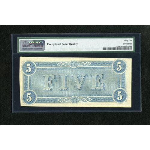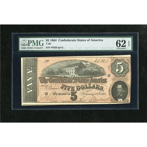 <B>T69 $5 1864.</B></I> This pleasing Memminger issue has been awarded the grade of <B>Uncirculated 62 EPQ</B></I> by PMG.<BR><BR><b>Shipping:</b> Coins & Currency (<a target="_blank" href="http://www.heritageauctions.com/common/shipping.php">view shipping information</a>)