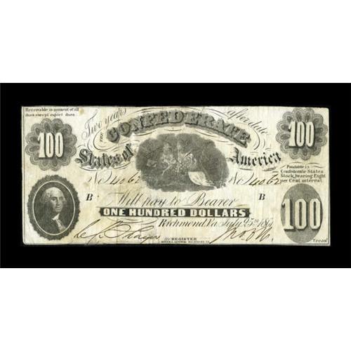 <B>T7 $100 1861. </B></I>Cr 9 PF-1 State II<BR> Almost <B>Very Fine </B></I>in appearance, but with several long repaired tears and some expert paper restoration. A more realistic grade would be <B>G-VG. </B></I>Although restored, this is a more affordable example that still has an attractive overall appearance. A tough variety with only eight examples enumerated in the Fricke census.<BR><BR><b>Shipping:</b> Coins & Currency (<a target="_blank" href="http://www.heritageauctions.com/common/shipping.php">view shipping information</a>)
