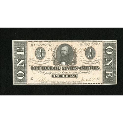 <B>T71 $1 1864.</B></I> Few Confederate issues retain the bright-near white originality that this paper displays. The eggshell like paper is wholly original. <B>Choice Crisp Uncirculated.</B></I><BR><BR><b>Shipping:</b> Coins & Currency (<a target="_blank" href="http://www.heritageauctions.com/common/shipping.php">view shipping information</a>)