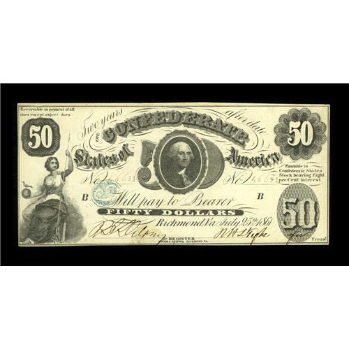 <B>T8 $50 1861.</B></I> A corner fold is found on this $50 that has a stamped blue "C" for "cancelled" on its face. <B>Choice About Uncirculated.</B></I><BR><I>From The George P. Hammerly Collection</B></I><BR><BR><b>Shipping:</b> Coin/Currency (<a target="_blank" href="http://www.heritageauctions.com/common/shipping.php">view shipping information</a>)