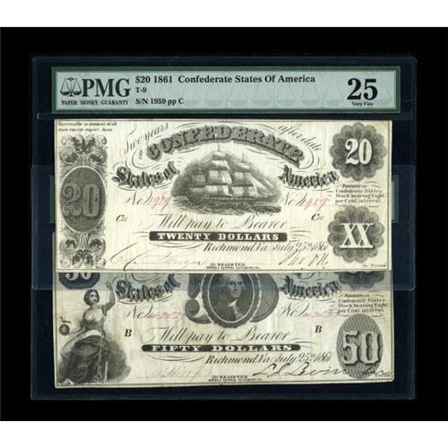 <B>T8 $50 1861 </B></I>Cr-15 PF-2 <B>PMG Very Fine 25<BR>T9 $20 1861 </B></I>Cr-29B PF-9 <B> PMG Very Fine 25.</B></I><BR> The $20 has minor margin splits according to the label.<BR><BR><b>Shipping:</b> Coins & Currency (<a target="_blank" href="http://www.heritageauctions.com/common/shipping.php">view shipping information</a>)