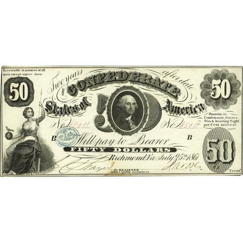 <B>T8 $50 1861.</B></I> "For" is hand-written before Treasr. on this interesting example that carries a rubber stamped blue "C" for "Cancelled." A small top edge tear and spot at bottom center are noticed. <B>Crisp Uncirculated.</B></I>