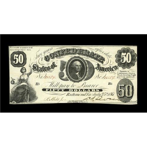 <B>T8 $50 1861.</B></I> Light handling is noticed on this early Confederate note. <B>About Uncirculated.</B></I>