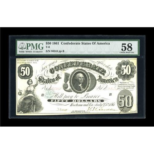 <B>T8 $50 1861</B></I> Cr-15/17, PF-2. Some faint handling is noted on this wholly original and bright Confederate issue, graded <B>Choice About Uncirculated 58</B></I> by PMG.<BR><BR><b>Shipping:</b> Coins & Currency (<a target="_blank" href="http://www.heritageauctions.com/common/shipping.php">view shipping information</a>)