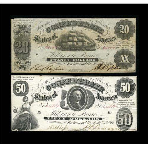 <B>T8 $50 1861.<BR>T9 $20 1861.</B></I><BR> This pleasing pair of early CSA notes grades <B>Very Fine</B></I>.<BR><BR><b>Shipping:</b> Coins & Currency (<a target="_blank" href="http://www.heritageauctions.com/common/shipping.php">view shipping information</a>)