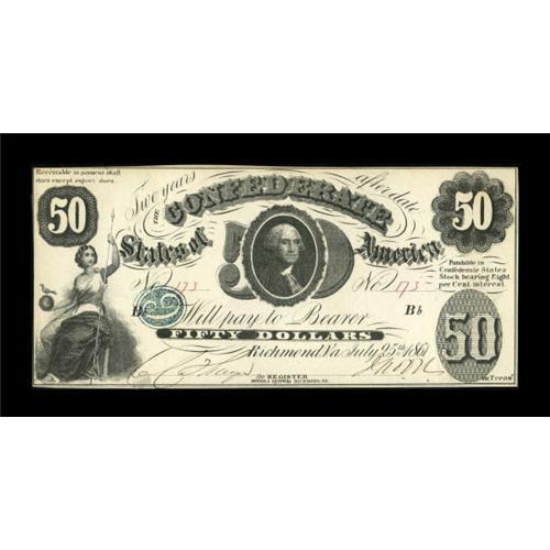 <B>T8 $50 1861.</B></I><BR> This is a beautiful <B>Choice Crisp Uncirculated</B></I> example of this Criswell number. Only briefly along the left edge is the cut inside the frame line. This note has a blue rubber-stamped "C" for cancel on it. It also carries serial number 173.<BR><BR><b>Shipping:</b> Coins & Currency (<a target="_blank" href="http://www.heritageauctions.com/common/shipping.php">view shipping information</a>)