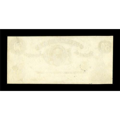 <B>T8 $50 1861.</B></I><BR> "For" is hand-written before Treasr. on this interesting example that also carries a rubber stamped blue "C" for "Cancelled." <B>Choice About Uncirculated.<BR></B></I><BR><BR><b>Shipping:</b> Coins & Currency (<a target="_blank" href="http://www.heritageauctions.com/common/shipping.php">view shipping information</a>)