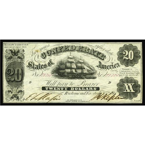 <B>T9 $20 1861.</B></I> This note appears unc at first glance, but when the proverbial fine tooth comb is put away, we have tallied a faint center and a corner fold. A couple of light mounting spots from old stamp hinges are also seen, plus a pencilled dealer notation on the back that could easily be removed. The perimeter of the note runs fully outside the frame line on this <B>About Uncirculated</B></I> $20.<BR><I>From The Benjamin Rush Powel Collection of Confederate Currency.</B></I>