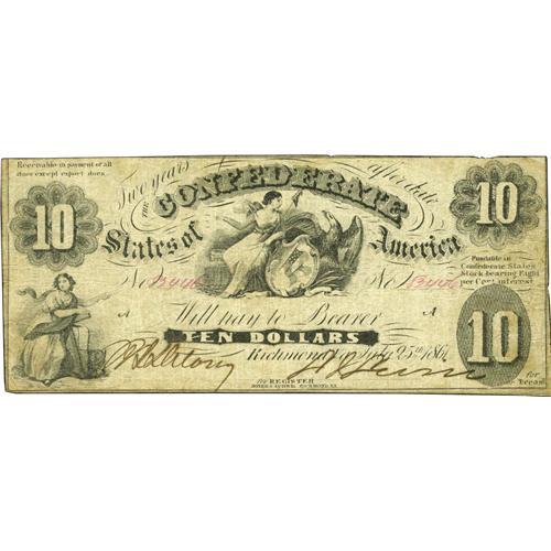 <B>T10 $10 1861.</B></I> This is a rare PF-14 variety with "for" printed before and above "Treasr." This is from a plate of eight $10 A plate letter notes and this error is from only the 6 position. Few survive today due to heavy circulation of these early lower denomination notes. At <B>Very Good+++</B></I> it easily could be ranked in the Fricke condition census. Also, with serial number 82446-A, it is less than 160 serial numbers away from the Thian example.