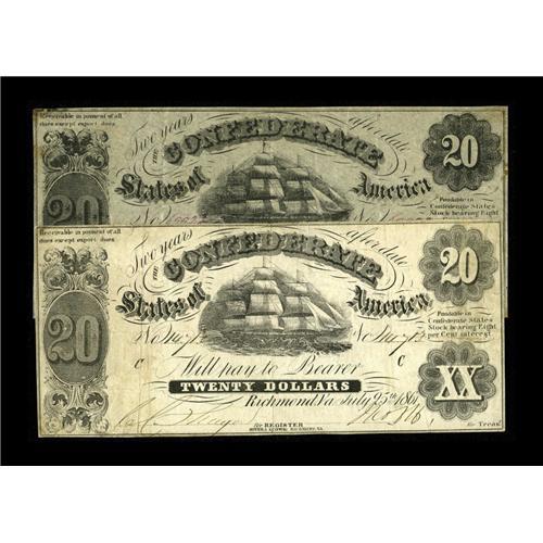 <B>T9 $20 1861 Two Examples.</B></I> The thick paper note grades <B>Fine</B></I> with a soiled back quarter panel and the thin paper note grades <B>Very Fine.</B></I><BR><I>From The George P. Hammerly Collection</B></I><BR><BR><b>Shipping:</b> Coin/Currency (<a target="_blank" href="http://www.heritageauctions.com/common/shipping.php">view shipping information</a>)