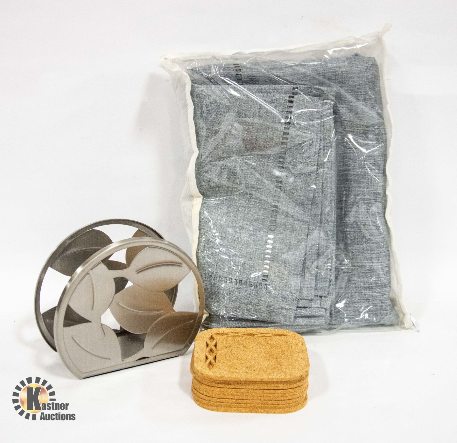 UMBRA METAL NAPKIN HOLDER AND A NEW SET OF GREY CANVAS/LINEN TYPE FABRIC TABLE CLOTH AND NAPKINS, WITH A VINTAGE CORK COASTER SET **ALL ITEMS MUST BE REMOVED BY 5PM SATURDAY, APRIL 15TH 2023. ALL REMAINING ITEMS WILL BE SUBJECT TO A $6.00 PER DAY STORAGE CHARGE. ANY ITEMS REMAINING AFTER MONDAY, APRIL 30TH, 2023 WILL BE CONSIDERED FORFEITED. NO REFUNDS WILL BE ISSUED FOR FORFEITED ITEMS. TO SCHEDULE A PICK UP APPOINTMENT CLICK HERE