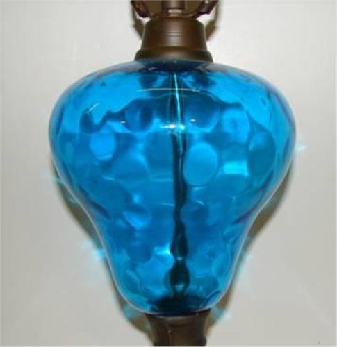 TABLE LAMP WITH BLUE GLASS BOWL. Brass stem and marble base. Has blue dot pattern glass bowl. Electrified. 25.5" H