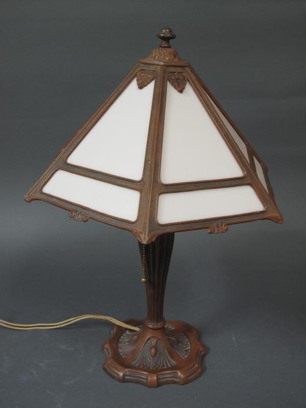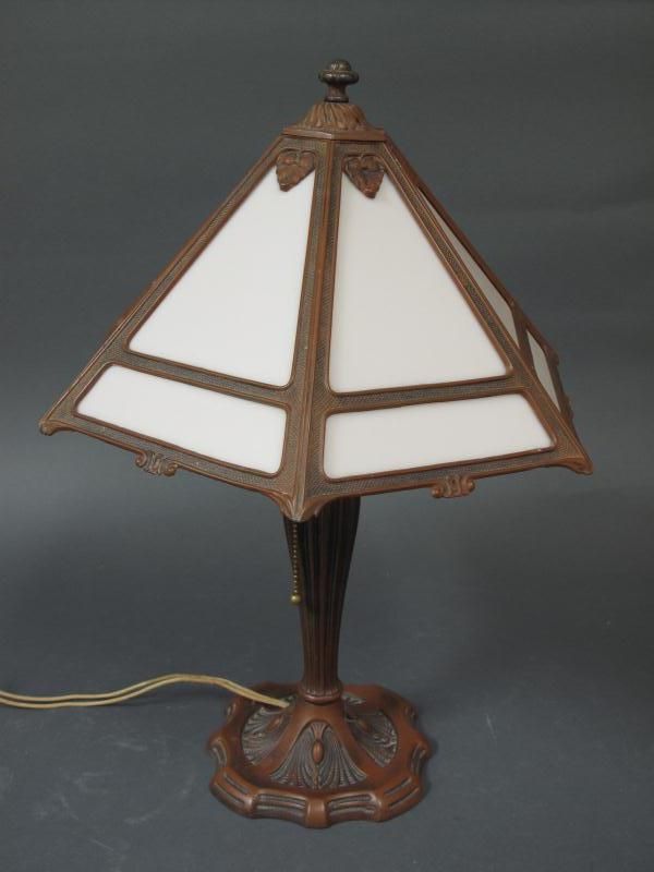 -on a column form base, with pink glass shade.