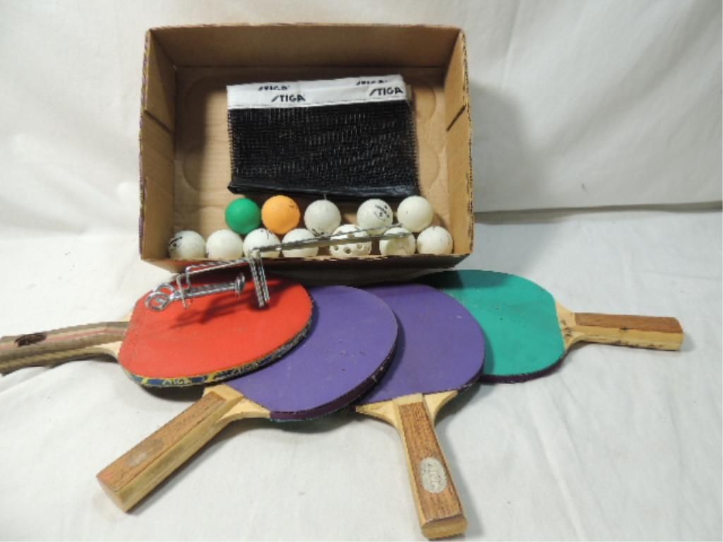 4 PADDLES, NET WITH TABLE ATTACHMENTS, 11 PING PONG BALLS. AS SHOWN SEE PHOTO FOR MORE DETAILS.