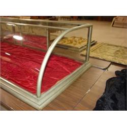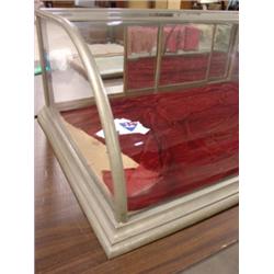 COUNTRY STORE TABLE TOP DISPLAY CASE. Rolled front. Two sliding mirrored doors in back. Good overall condition. 15" H, 75.5" W, 27" D