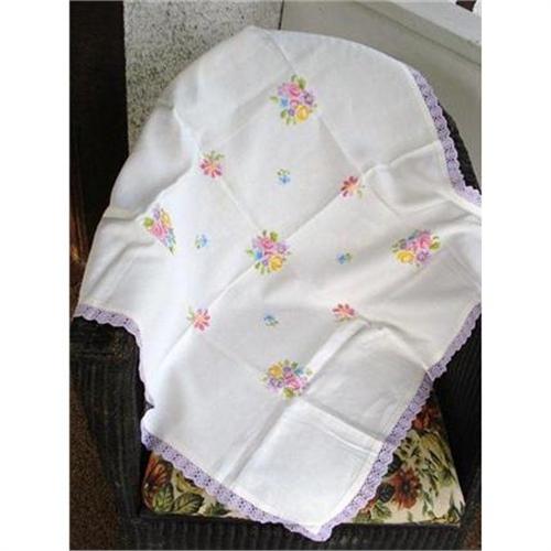 BEAUTIFUL HAND EMBROIDERED TABLECLOTH,DEPICTING COLORFUL ROSES AND FLOWERS, LOVE THE LAVANDER COLOR HAND CROCHETED LACE EDGE - as per images - In excellent used condition ,Measures about 35" x 35", US Buyer to pay 5.00 for shipping plus insurance.THANKS.