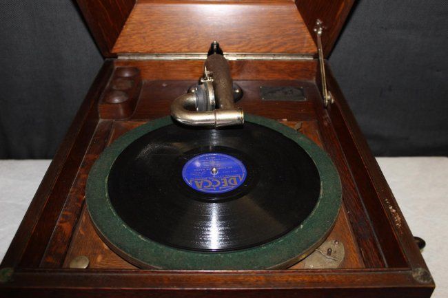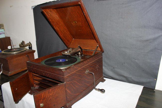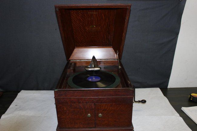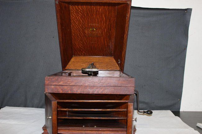TABLETOP VICTOR TALKING IN MINT CONDITION WORKS GREAT OAK W/ LIFT TOP LID