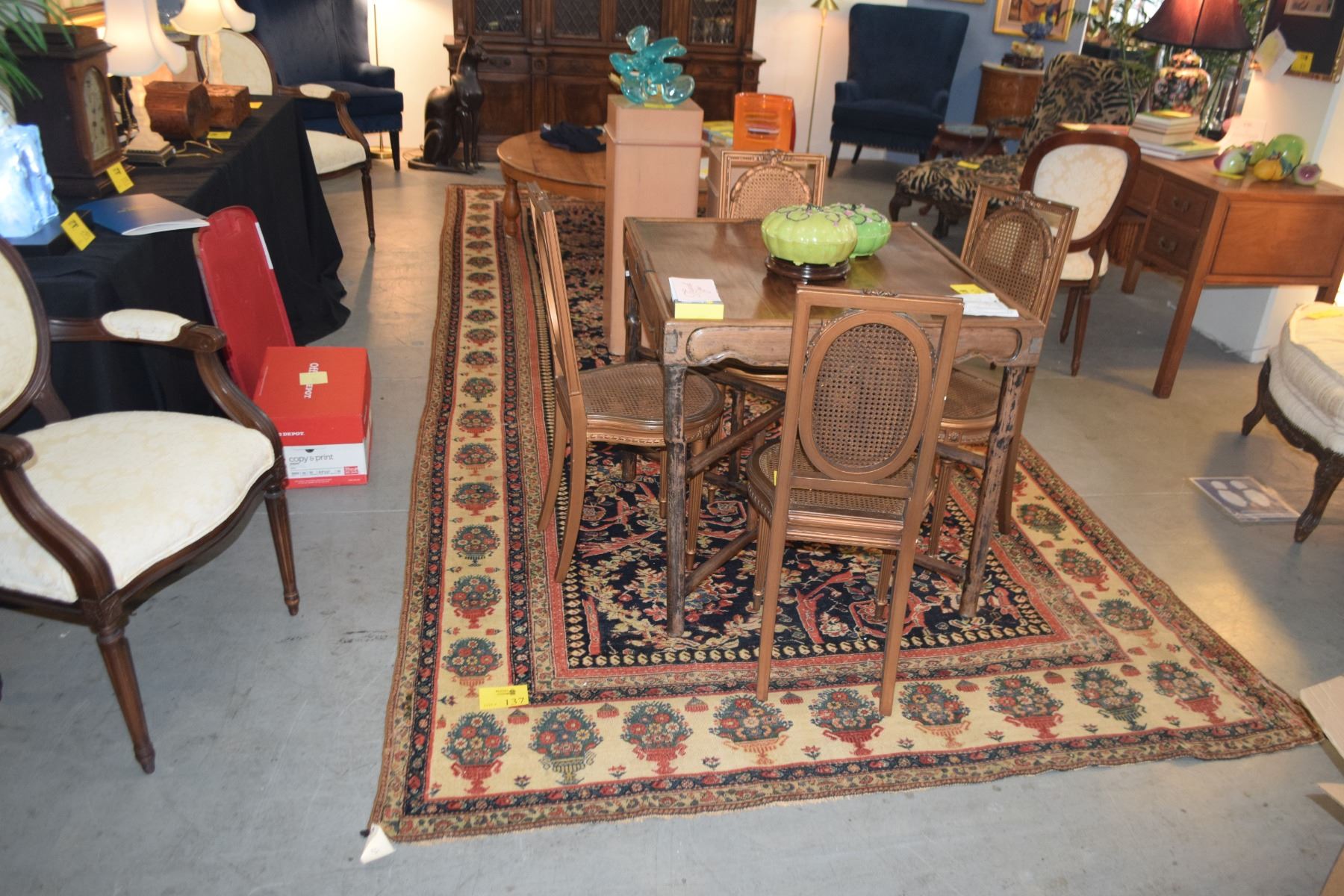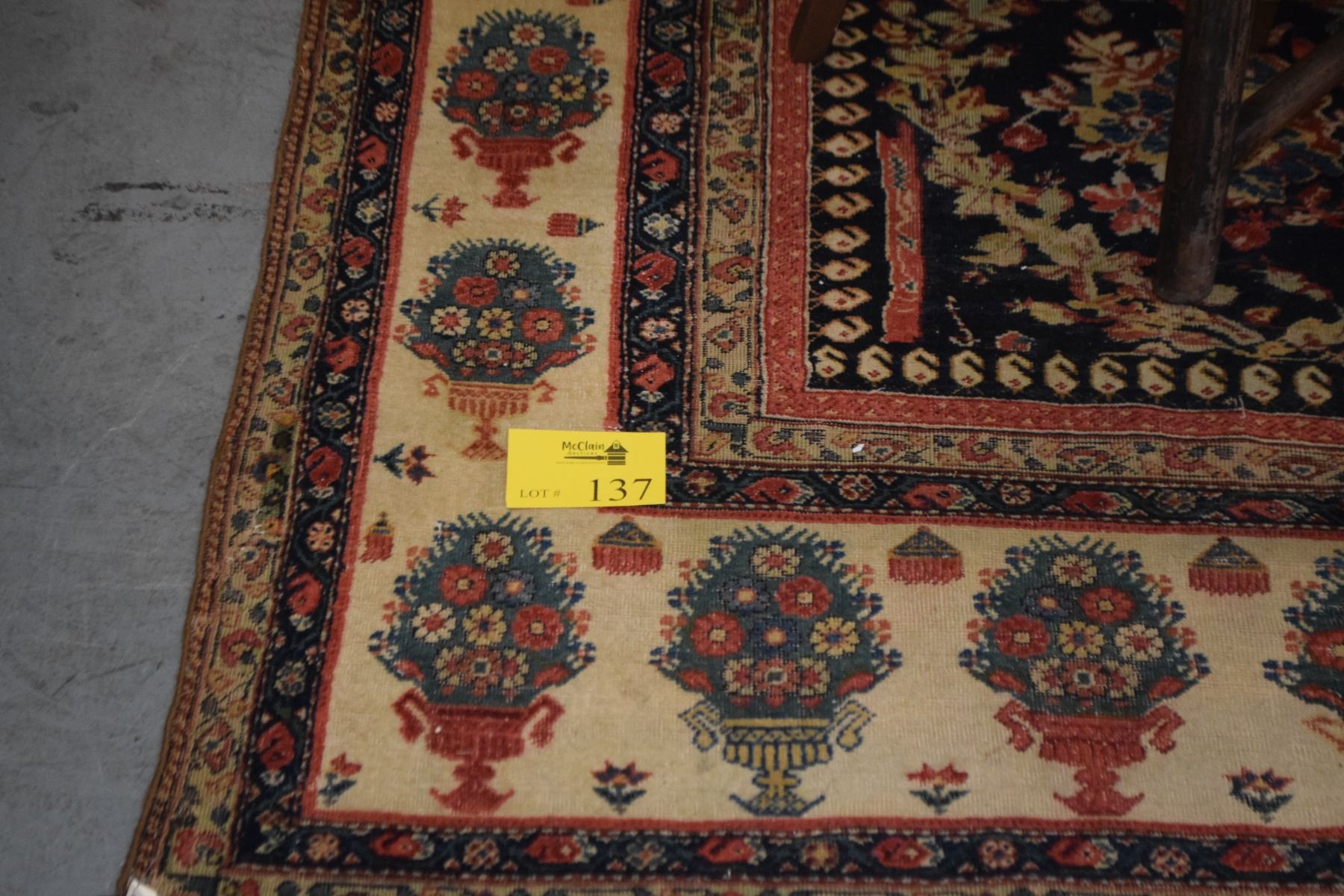 TABRIZ HAND KNOTTED WOOL PILE RUG, THE DARK BLUE FIELD W/SCROLLING FLORAL VINES & FLOWERS IN ROSE PINK, LIGHT BLUE, TAN & OFFICE-WHITE, THE CREAM BORDER W/FLOWER URNS FLANKED BY FLORAL GUARD STRIPE, IRANIAN, CA. 1900 (REPAIRED) (6' 6" X 16" 6")