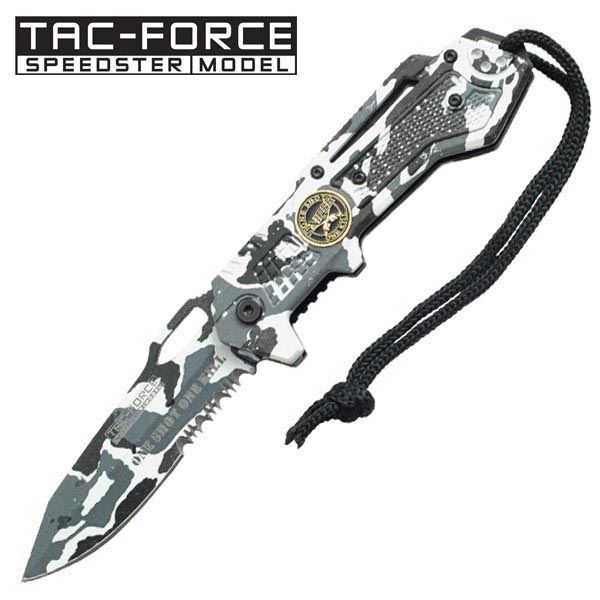 TAC-FORCE 4.5" CLOSED WINTER CAMO FOLDING POCKET KNIFE **|**|** TAC-FORCE 4.5" CLOSED WINTER CAMO FOLDING POCKET KNIFE W/SNIPER MEDALLION ON HANDLE