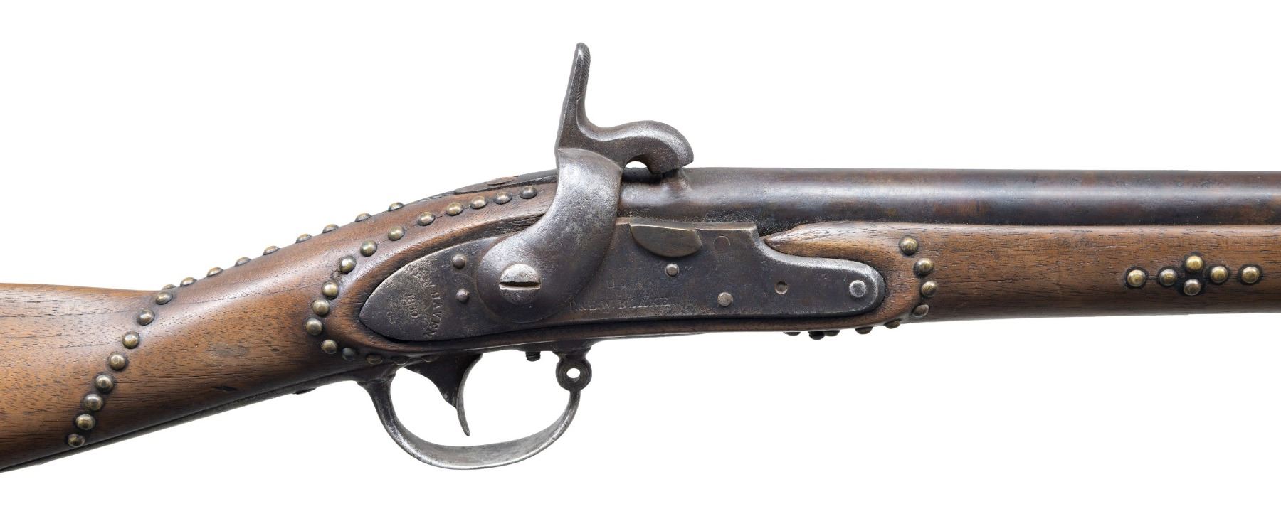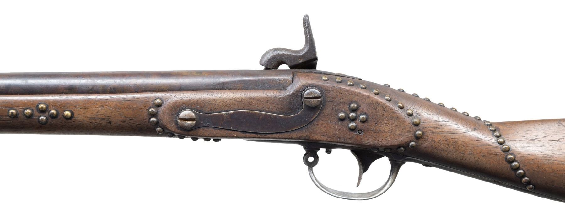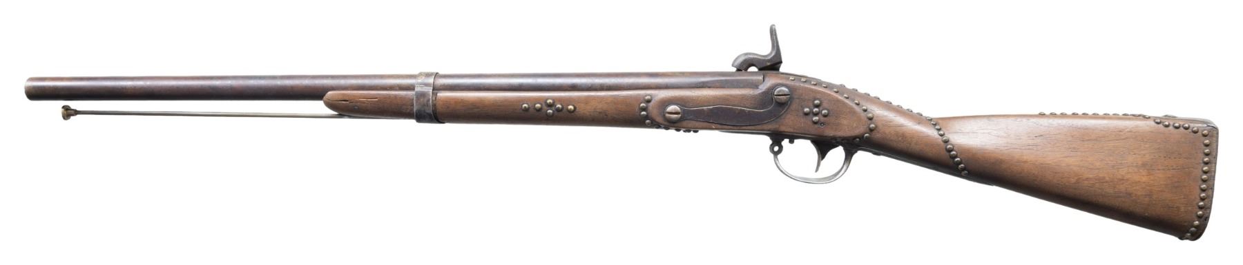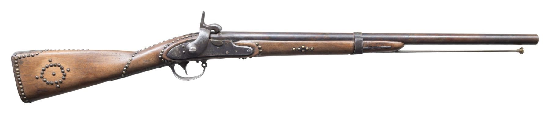 Cal 69. NSN. 41.25" overall, 25.5" welded cone percussion conversion with no discernible proofs, iron furniture, single barrel band, started life as 1830 dated Blake, New Haven, CT contract musket. Decorated beautifully with over 100 well patinaed tacks, such as found on many Plains Indian firearms. CONDITION: good overall, muzzle face shows machine finishing marks, good mechanics, smooth clear bore. (01-26510/JS). ANTIQUE. $600-800.