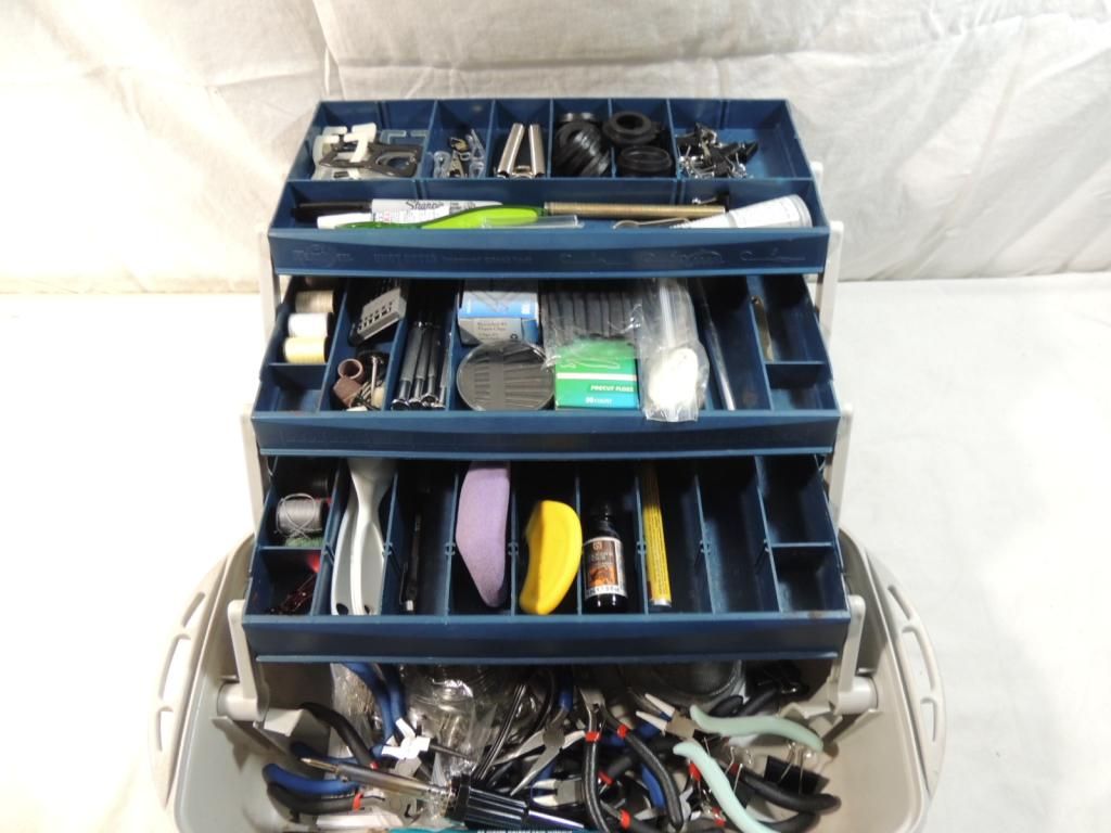 TACKLE BOX FULL JEWELRY MAKING SUPPLIES. SUPER GLUE, CLIPS, SPRINGS, NEEDLE NOSE PLIERS. STRING, NEEDLES, ASSORTED AS SHOWN SEE PHOTO FOR MORE DETAILS.