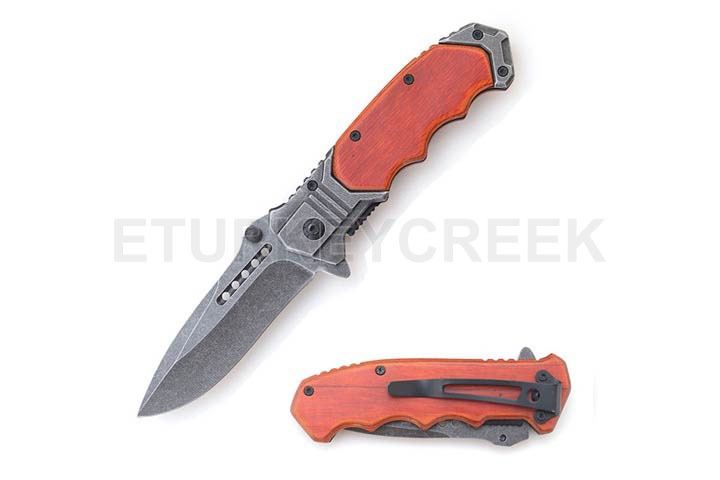 TACTICAL SPRING ASSIST KNIFE 4.5" CLOSED, STAINLESS STEEL STONE WASH BLADE, ORANGE WOOD HANDLE POCKET CLIP 4.5" CLOSED 3.25" BLADE