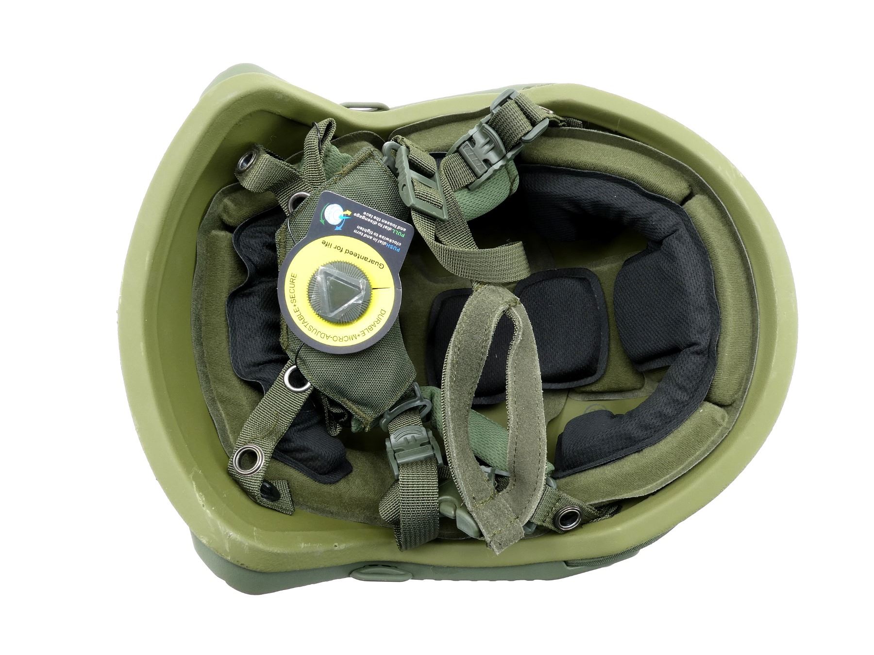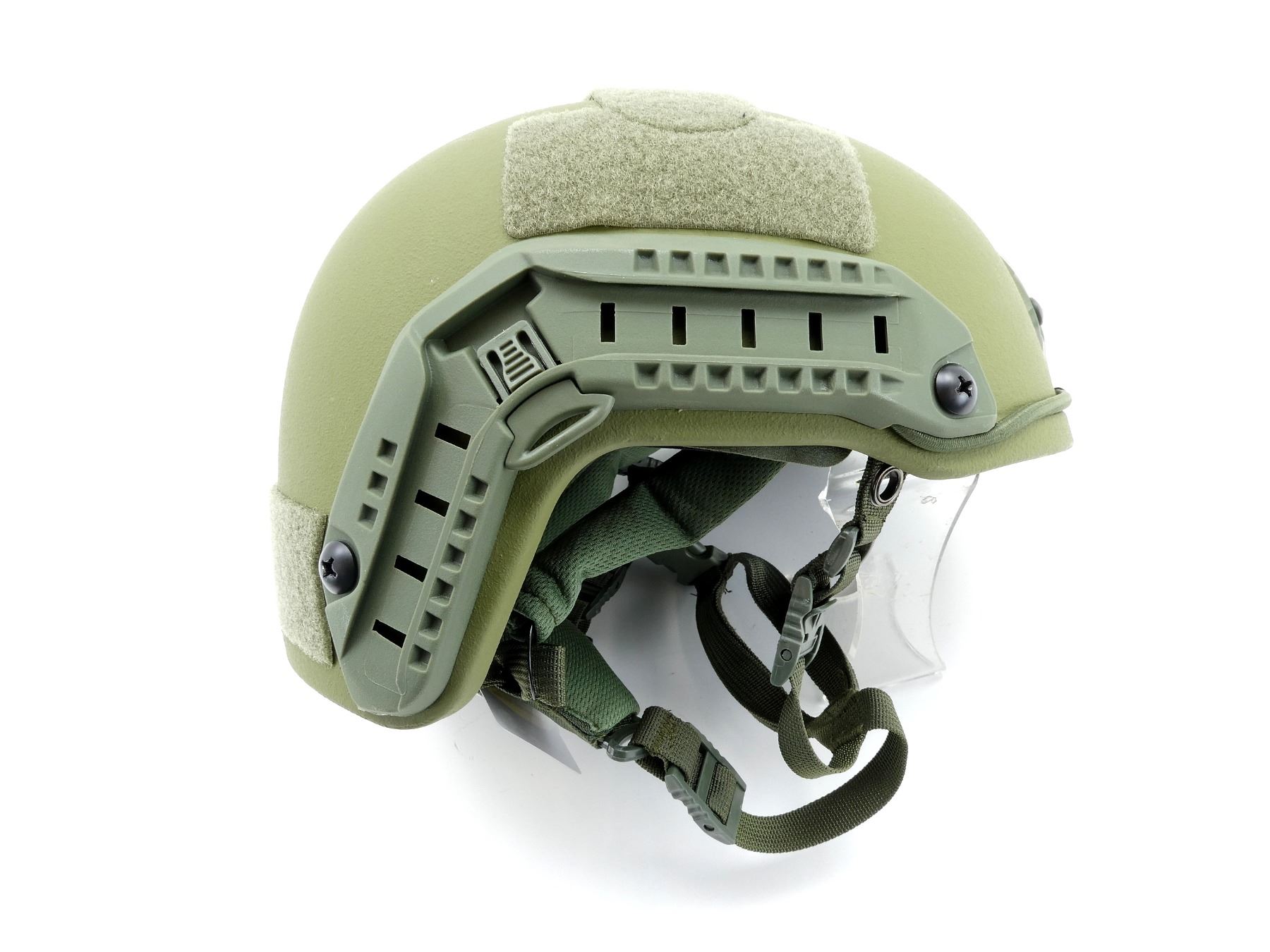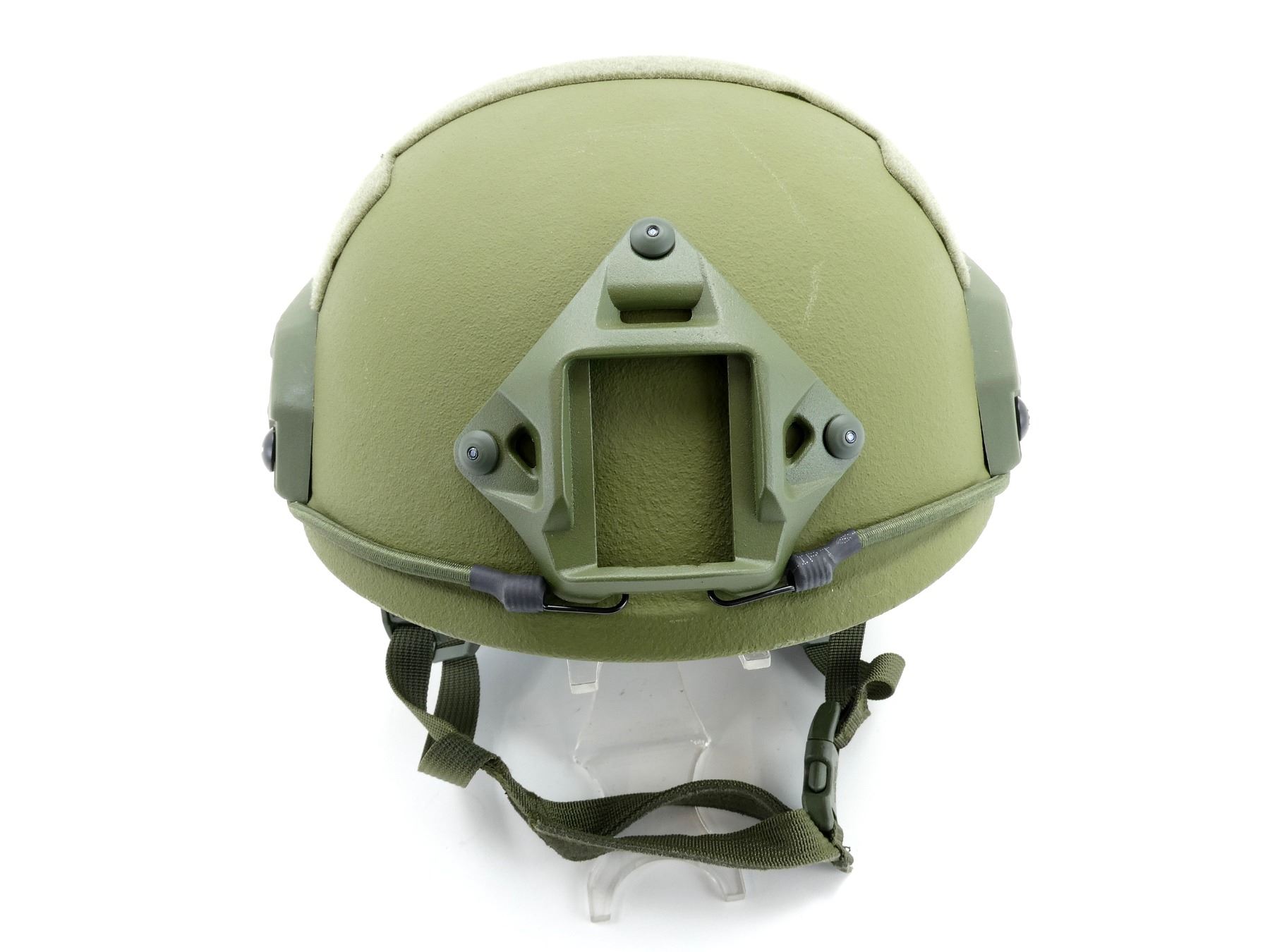 (1) ARAMID HELMET, GREEN, LEVEL 3A PROTECTION, HIGH-CUT FAST WITH WENDY SUSPENSION SYSTEM, ONE SIZE, FULLY ADJUSTABLE, INCLUDES ARC RAIL & VARIOUS VELCRO ATTACHMENT POINTS, NVG SHROUD TO FIT MOST COMMON NVGS, NOS. SEE PHOTOS.