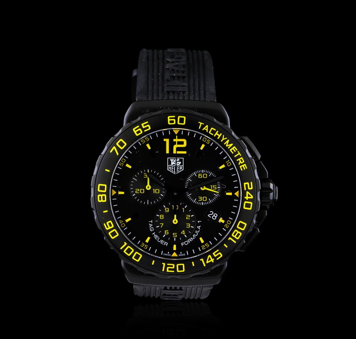 One TAG Heuer Formula 1 Chronograph men's watch featuring: Case: Stainless steel and black titanium. Bezel: Black titanium with tachymeter markings. Crystal: Scratch-resistant sapphire. Dial: Black color; black hands; yellow index hour markers. Features: Chronograph (three sub-dials displaying 60 second, 30 minute, and 1/10th of a second); date window located at the 4 o'clock position. Bracelet: Black rubber strap.