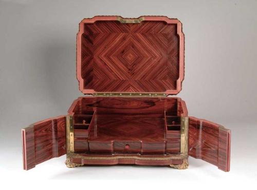 TAHAN INLAID LETTER BOX. Magnificent letterbox has delicate wood inlays around the entire box and is trimmed with a fine ornate ormolu band around top, bottom and has ormolu feet. The lid lifts and double front doors open to expose a diamond matched veneer interior with covered compartments and drawer. Piece is signed on the brass lock plate on cover “Tahan”. SIZE: 16-1/2” x 12-1/2” x 9-1/2” t. CONDITION: Some minor damage to veneer inlay at corners, otherwise very good. 5-71735