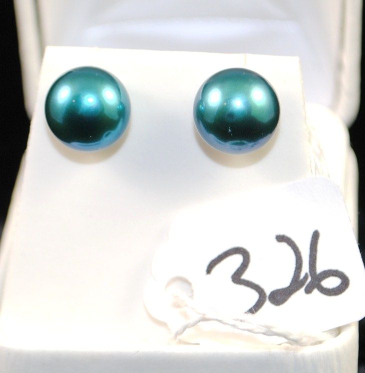 TAHIATIAN TEAL COLOR PEARL EARRINGS WITH 14K YELLOW GOLD CLASPS