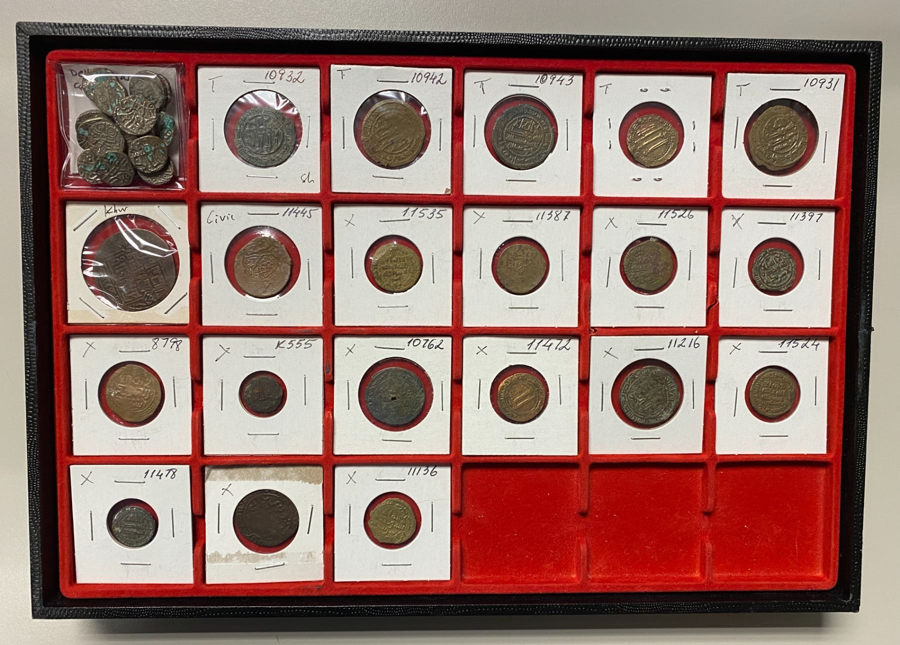 TAHIRID, etc.: LOT of 20 copper coins and 18 billon jitals, includes 5 examples of the Tahirid ruler Tahir II b. 'Abd Allah (845-862) dated AH233 or 241, plus one of the Khwarismshahs and one Civic copper, average at least Fine condition; plus 13 poor quality miscellaneous issues of minimal value and a group of Indian jitals assigned by the consignor to the Rajas of Delhi (not checked), average F-VF, cleaned; retail value $400, lot of 38 pieces.