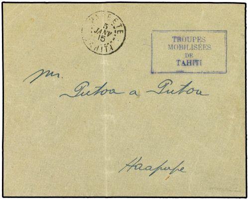 1915 Local mail envelope to Haapape cancelled by PAPEETE TAHITI double ring with military cachet TROUPES MOBILSEES DE TAHITI in blue. Very fine and scarce.