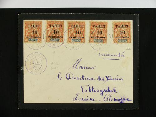 1906 Registered mourning envelope to Germany bearing 10 on 40 c orange (Yvert 32) tied by PAPEETE TAHITI double ring in violet with manuscript "Recommandee". Very fine.