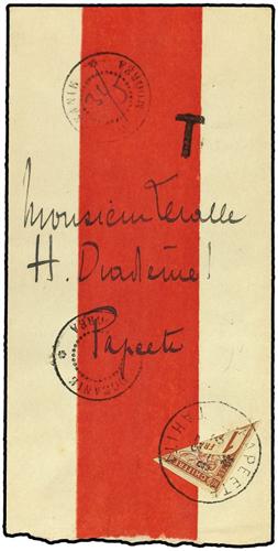 1923 Unstamped Red Band envelope to Papeete cancelled by MOOREA OCEANIE double ring, with TAX handstamp and bearing French General Colonies postage due 1f lilac/brown (bisect) (Yvert 26) applied and tied on arrival by PAPEETE TAHITI datestamp. Very fine.