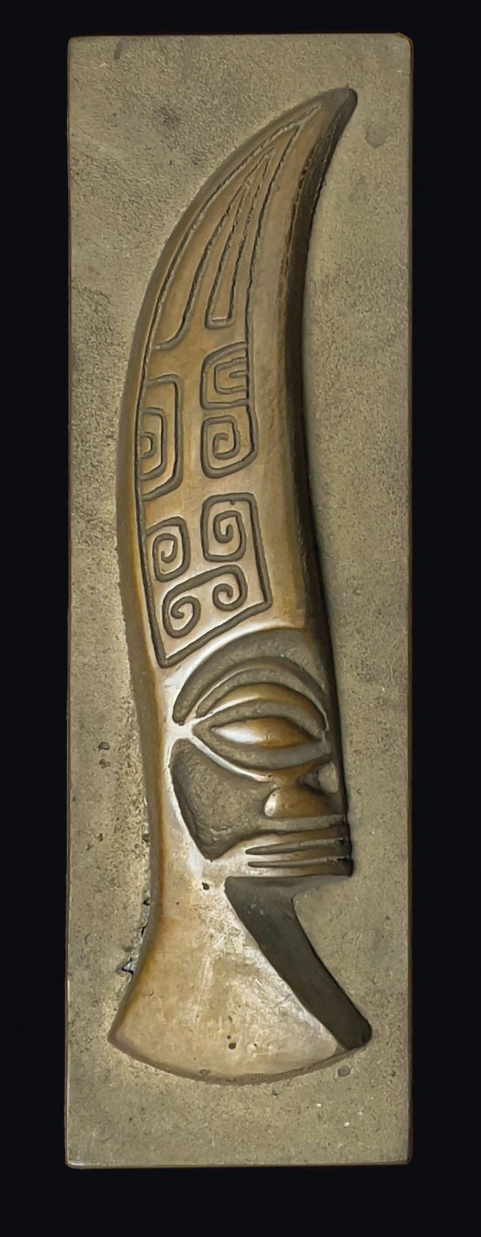 (1960s) A very rare OA design for a Tahitian tiki door pull. This is for the block handle version. Solid bronze. 11"x3.5". VG+.